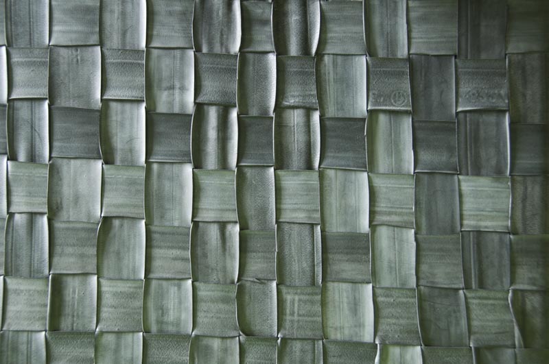 Gefäß: Glasgefäß überwoben mit Fahrradschlauchstreifen.