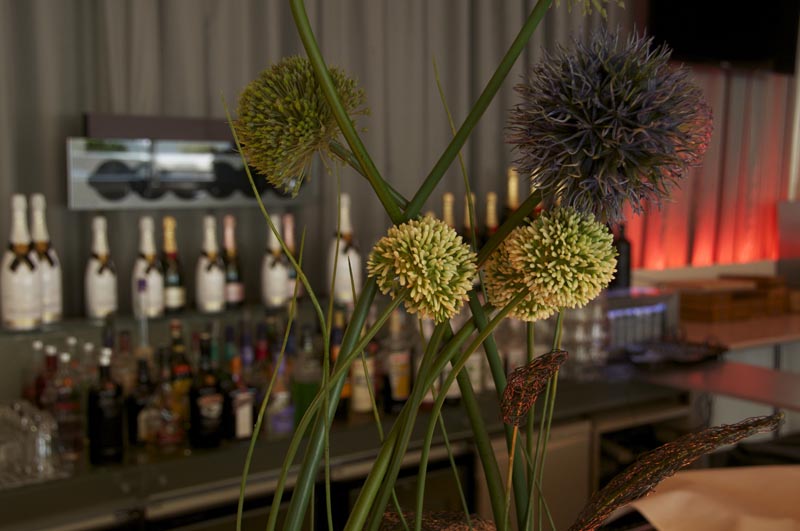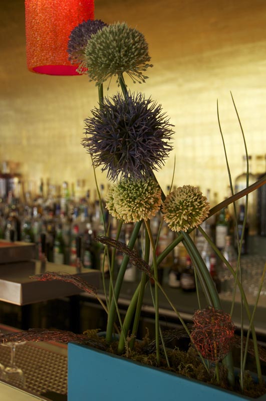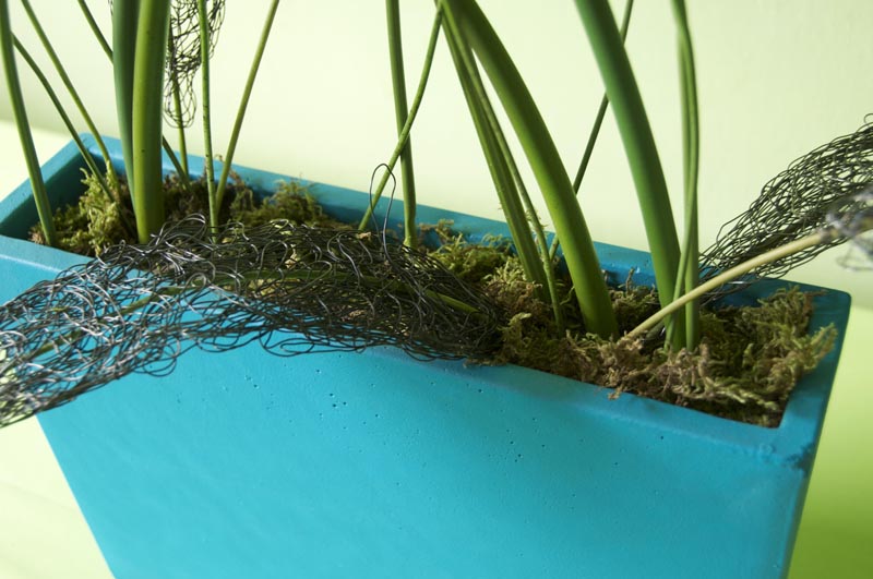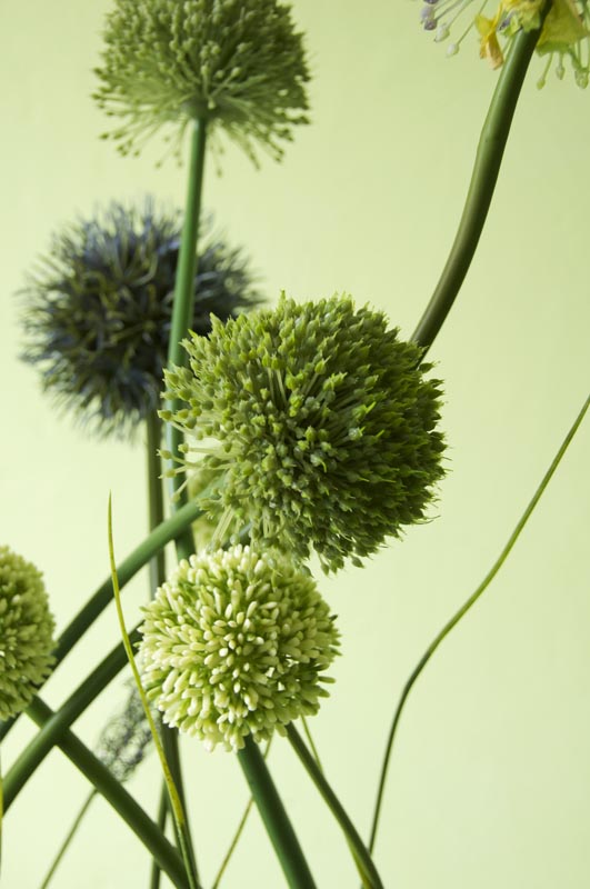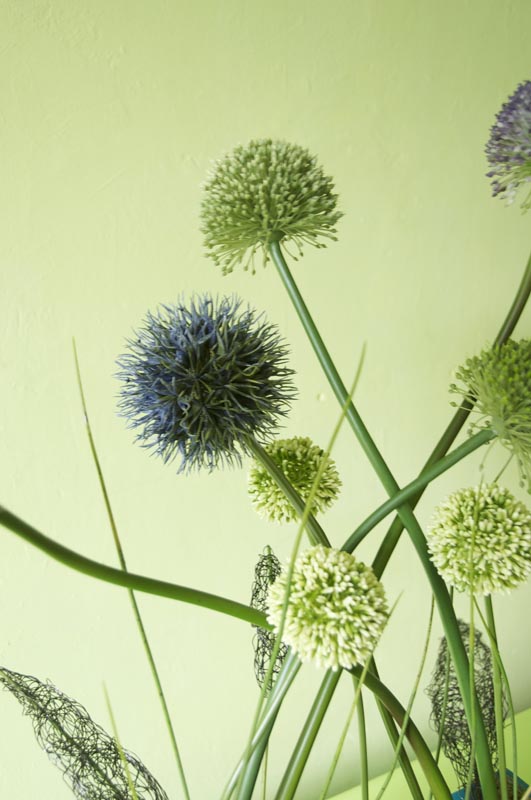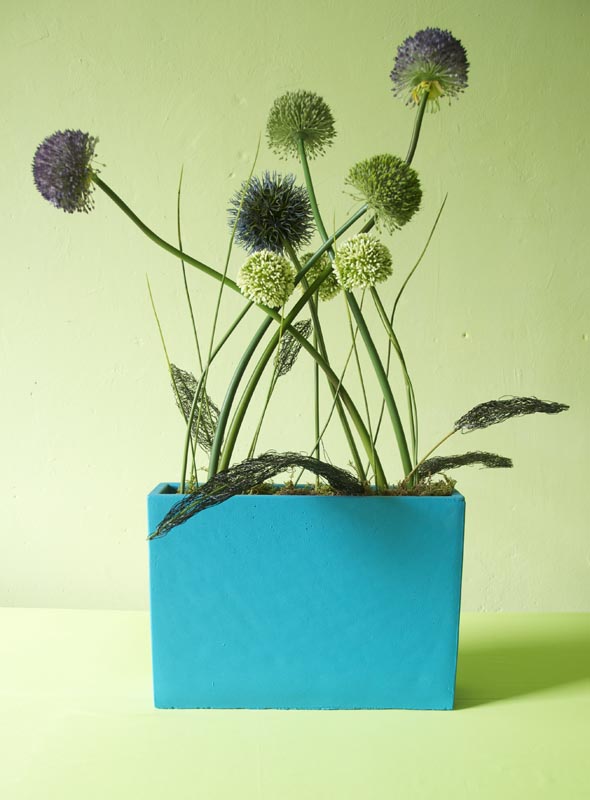 Gefäß: Rechteckiges Gefäß 8 Stiele Allium in violett, dunkelblau, grün und creme. Gesamthöhe ca. 85cm, Breit ca. 60 cm, Gewicht ca. 8 kg.