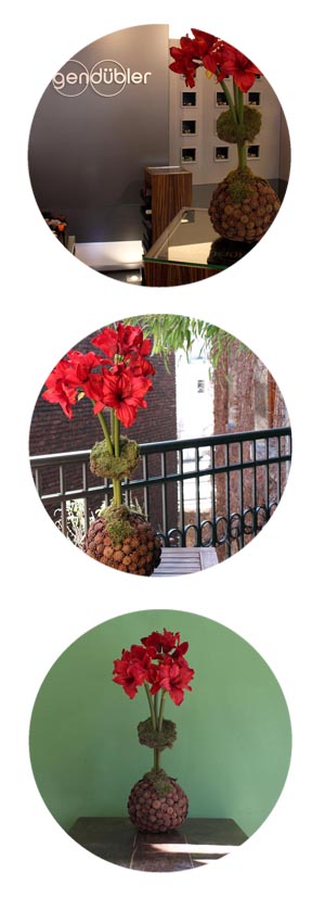 3 Stiele roter Amaryllis mit je 3 Blüten. Dazu Ring aus Naturmoos.
