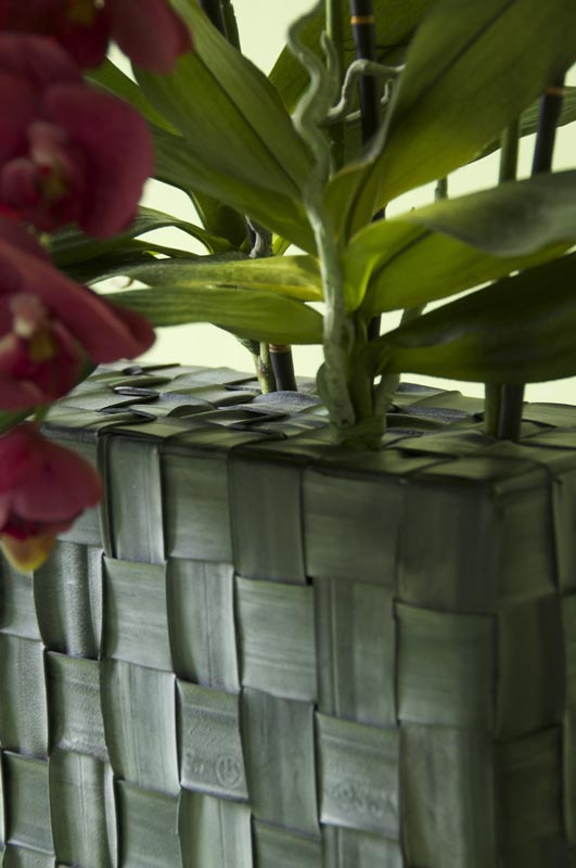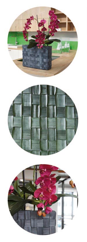Gefäß: Glasgefäß überwoben mit Fahrradschlauchstreifen.