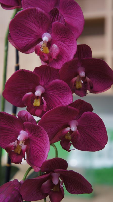 3 Stiele Orchideen/Phalaenopsis an Bambusstäben, Blüte mit Silikonfinish in purpurrot mit