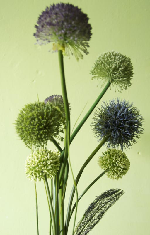 Gefäß: Rechteckiges Gefäß 8 Stiele Allium in violett, dunkelblau, grün und creme. Gesamthöhe ca. 85cm, Breit ca. 60 cm, Gewicht ca. 8 kg.