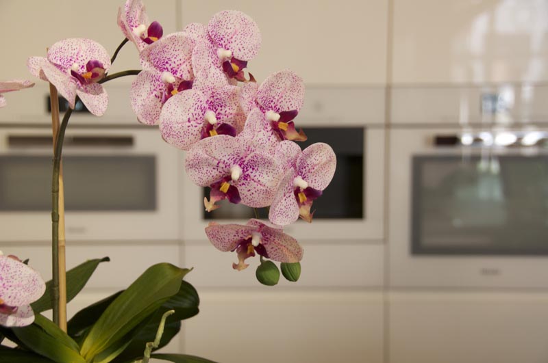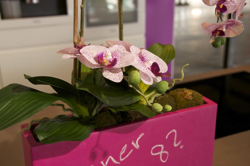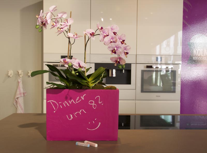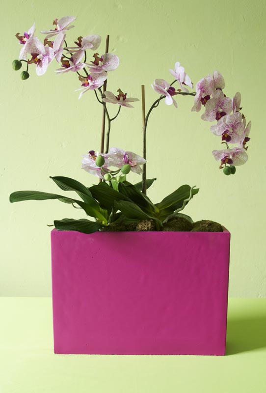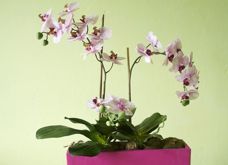 Gefäß: Rechteckiges Gefäß 3 Stiele weiß-pinker Orchidee/Phalaenopsis, Blätter & Luftwurzeln. Gefäß aufgefüllt mit Moosschwämmen. Gesamthöhe ca. 75cm, Breit ca. 60 cm, Gewicht ca. 7,9 kg.