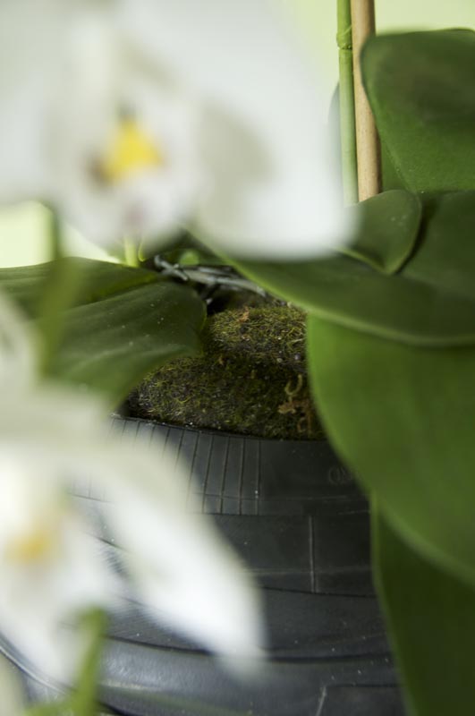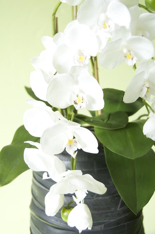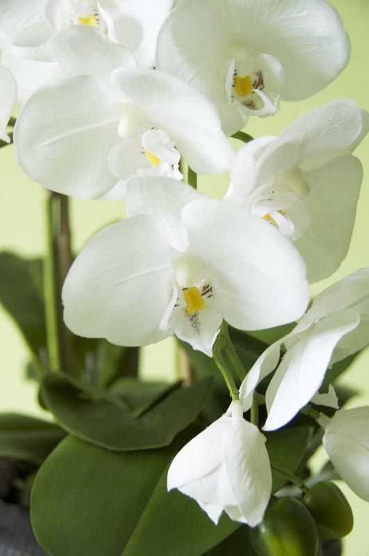 3 Stiele weißer Orchideen/Phalaenopsis an Bambusstäben, Blüte mit Silikonfinish, Blätter und Luftwurzeln. Gefäßöffnung abgedeckt mit Moosschwämmen.