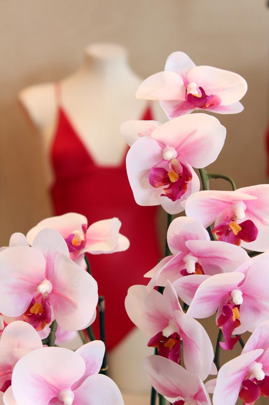 Gefäß: Weiße elegante Keramik mit handmade Wölbungen, 3 Stiele weiß-pinker