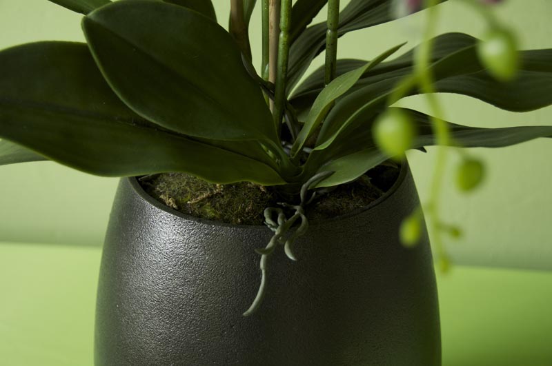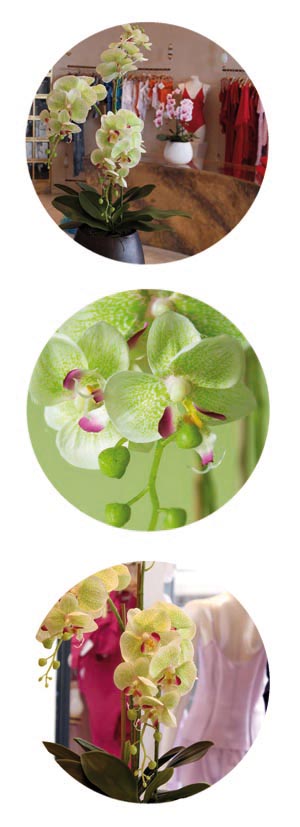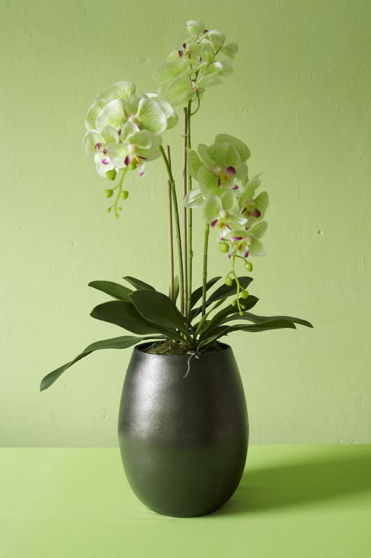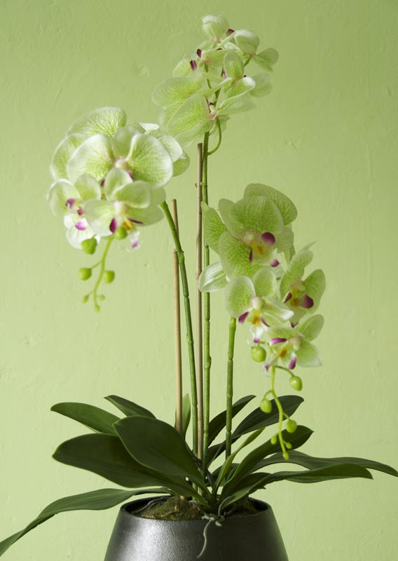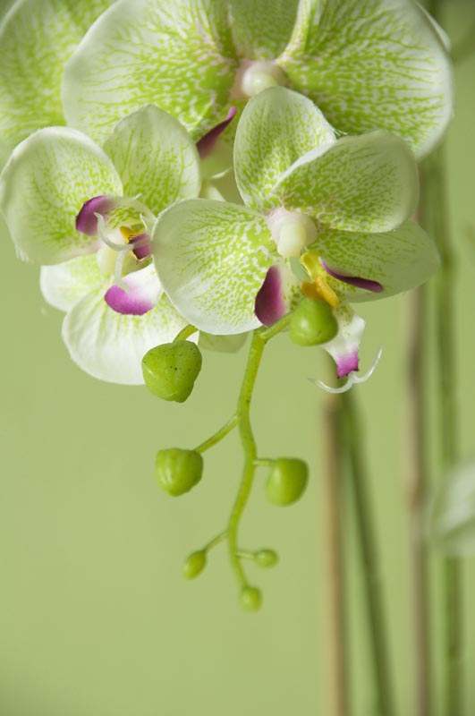 3 Stiele Orchideen/Phalaenopsis an Bambusstäben, textile Blüte ohne Silikonfinish in hellgrün mit pink. Gefäßöffnung aufgefüllt mit Moosschwämmen.