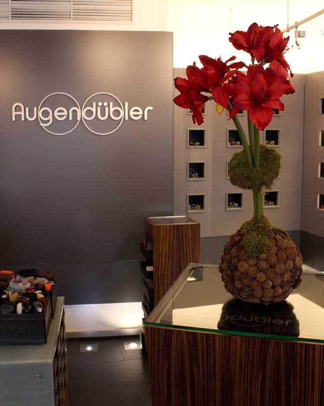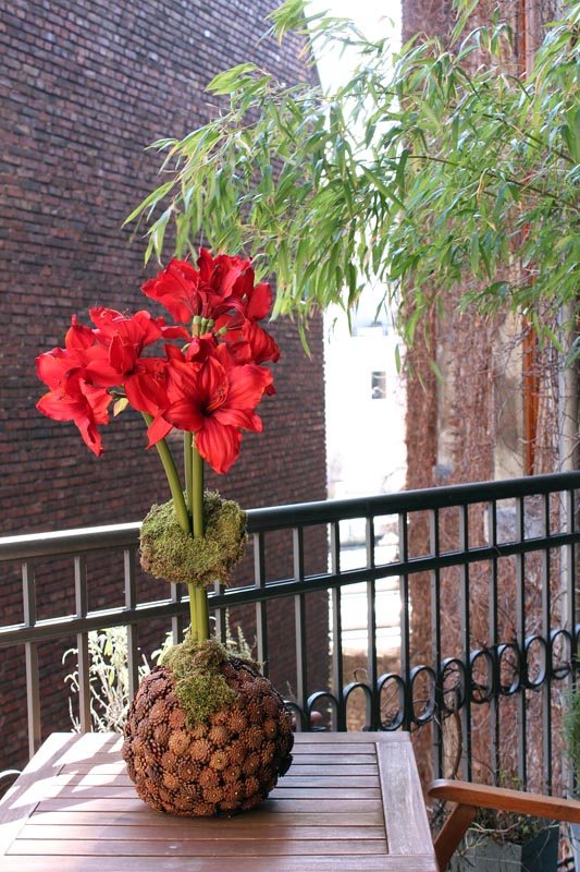 3 Stiele roter Amaryllis mit je 3 Blüten. Dazu Ring aus Naturmoos.